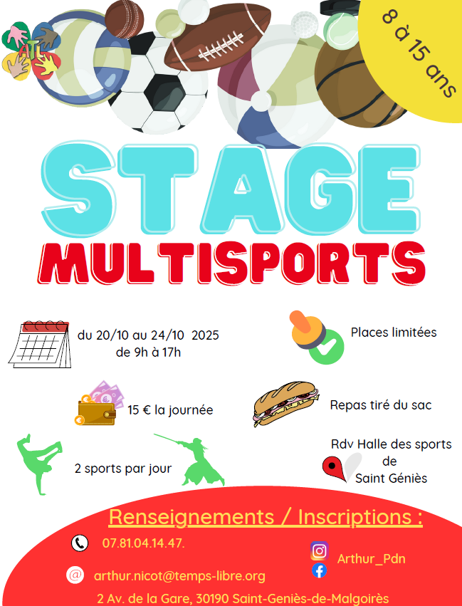 Notre stage multi-sports revient !!! Du 20 octobre au 24 octobre 2025 , votre enfant pourra venir sur 5 jours pratiquer une activité physique. De 9h00 à 17h00, pour 15€ / jour, à la halle aux sports de St Geniès de Malgoirès. Renseignement et inscriptions auprès de Arthur NICOT notre animateur jeunesse au 07 81 […]