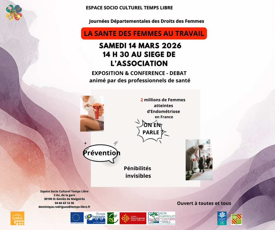 À l’occasion des Journées Départementales des Droits des Femmes, l’Espace Socio-Culturel Temps Libre vous invite à une après-midi de sensibilisation et d’échanges dédiée à une thématique essentielle mais souvent méconnue : la santé des travailleuses. Parce que le bien-être au travail est un levier majeur de l’égalité, nous avons choisi de mettre en lumière deux enjeux de santé publique cruciaux : l’endométriose et les pénibilités invisibles spécifiques aux métiers de la petite enfance.