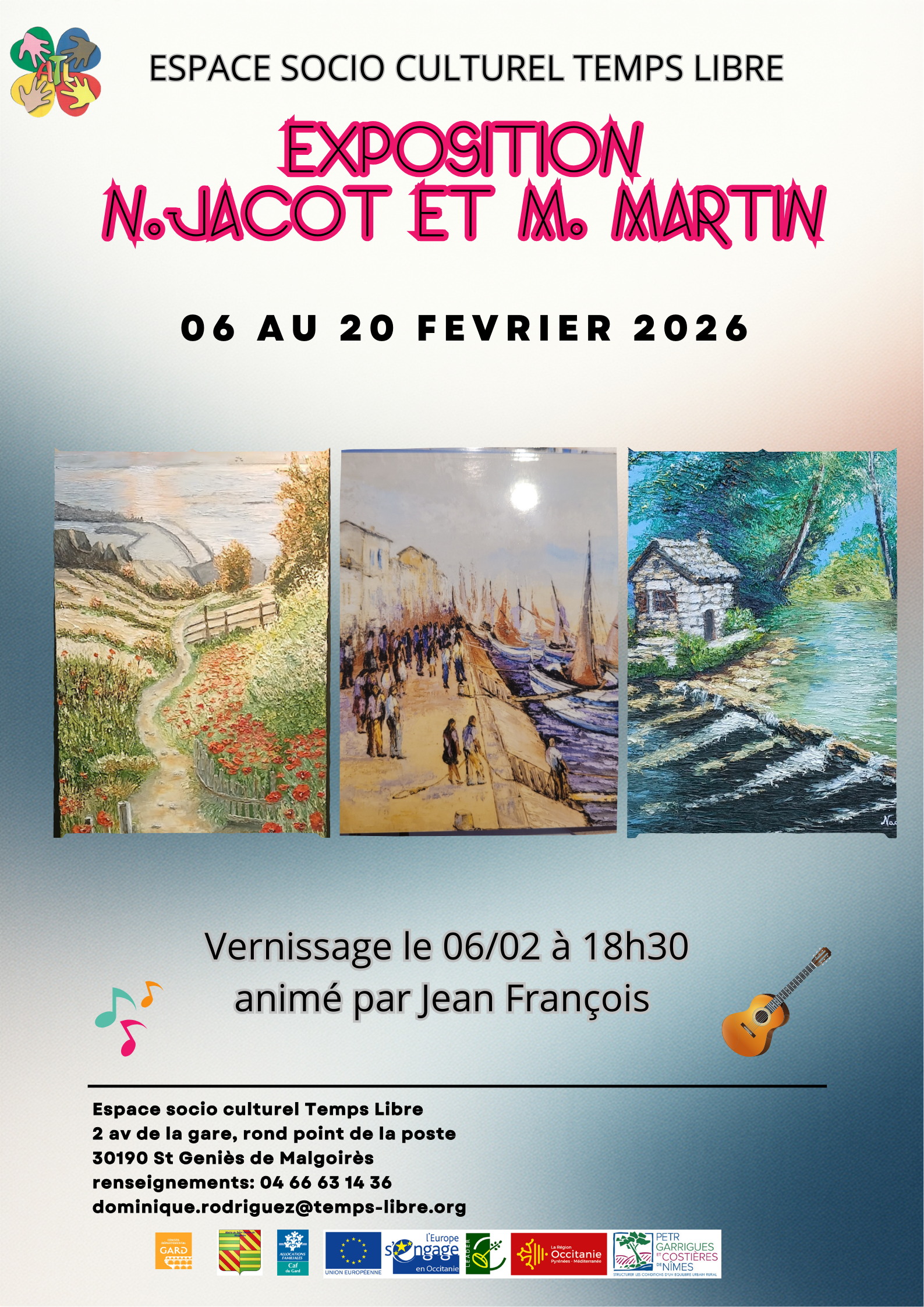 Vendredi 06/02/2026 VERNISSAGE 18H30 ANIM2 MUSICALEMENT PAR LE GUITARISTE JEAN FRANCOIS COLOMBO ESPACE SOCIO CULTUREL ST GENIES DE MALGOIRES  Portraits d'Artistes Nadine Jacot (Nad’Ev) "La peinture est mon évasion, le […]